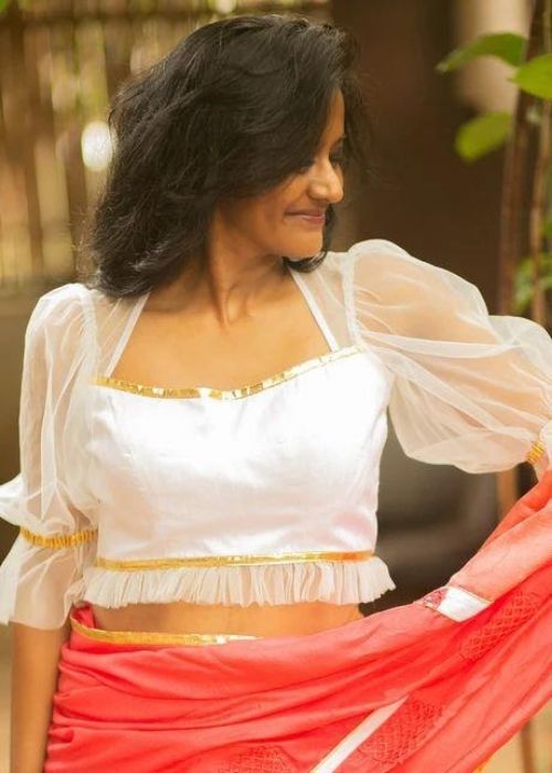 इस सुंदर नेट ब्लाउज़ को कॉटन फ़ैब्रिक के संग मिलकर बनाया गया है। अगर आप अपने लिए एक बैकलेस ब्लाउज़ सिलवाना चाहती हैं तो ये डिज़ाइन आपके लिए एक अच्छा विकल्प साबित हो सकता है। नेट पर की हुई कारीगरी के अतिरिक्त इस ब्लाउज़ में पोटली बटन का भी उपयोग हुआ है।